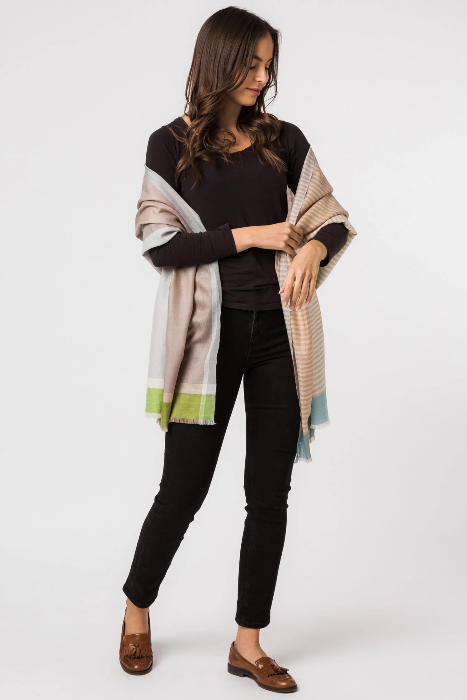 The ‘Charon’ shawl wrap from Pure Luxuries London is woven from 50% cashmere and 50% merino wool blend for a soft yet durable feel. Features a mixture of greens, blues and creams. This beautifully lightweight shawl wrap can be styled in a range of different ways. Pair with our other matching cashmere accessories. Presented in a 100% cotton Pure Luxuries branded pouch, ideal for gifting.