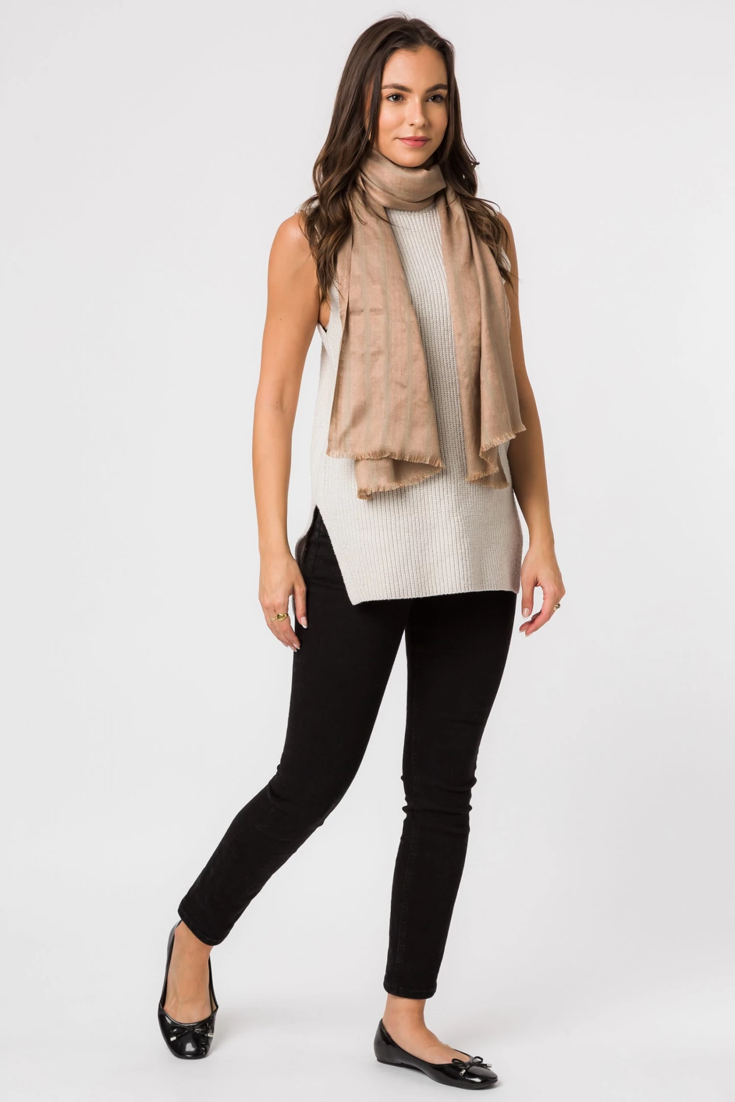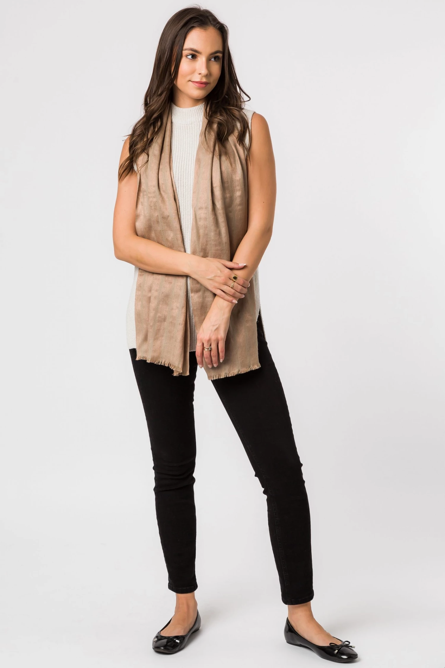 The ‘Moon’ pashmina from Pure Luxuries London is woven from 50% cashmere and 50% merino wool blend for a soft yet durable feel. A beige coloured design enhanced by light blue stripes and a metallic thread running through. Create eye-catching looks in an instant with this beautiful and classic accessory. Can be worn multiple ways around the neck, depending on your preference. Pair with our matching cashmere accessories. Presented in a 100% cotton Pure Luxuries branded pouch, ideal for gifting.
