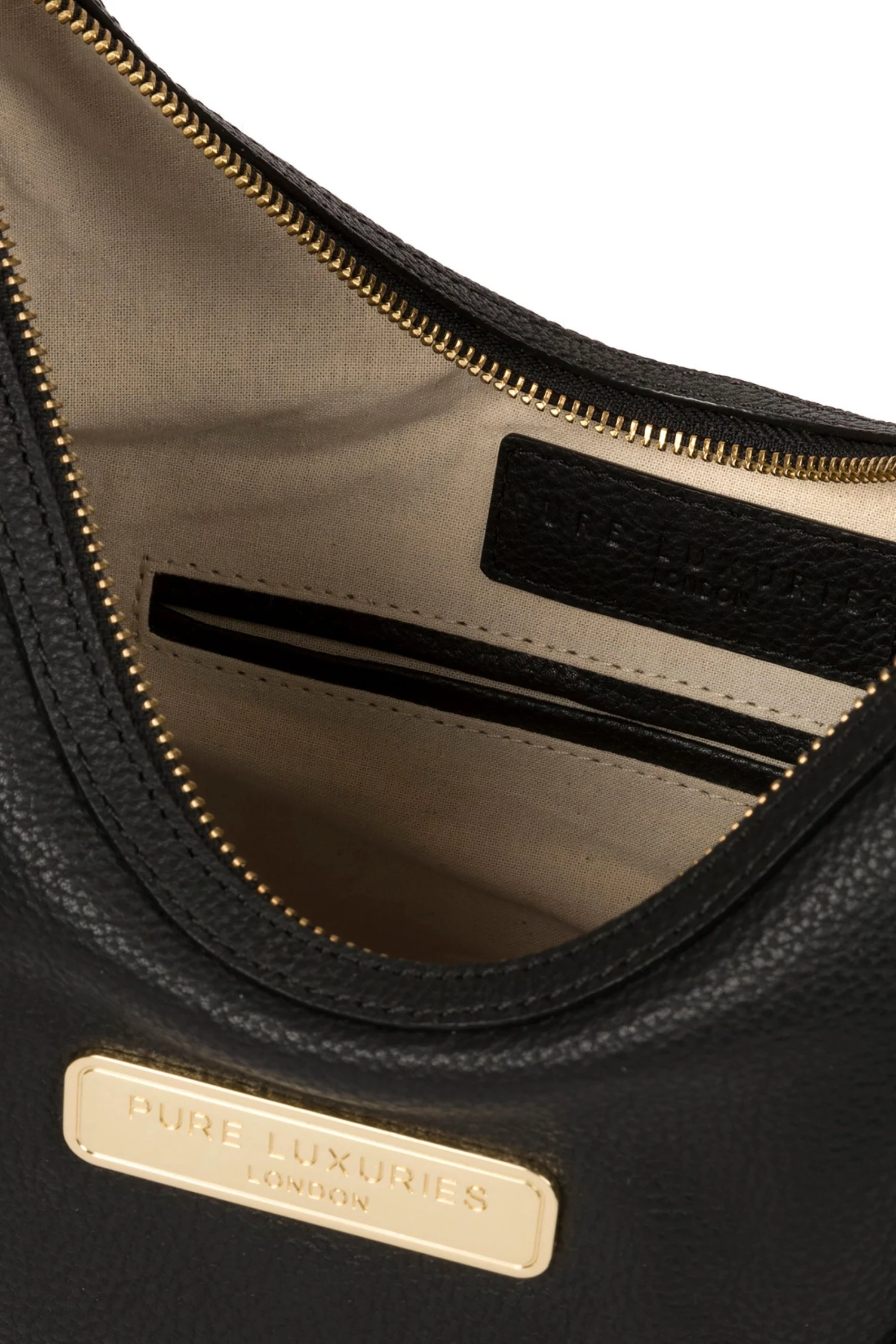 The ‘Felicity’ leather shoulder bag is handmade from genuine leather that has a rich and beautifully soft pebble grain finish. Part of the Pure Luxuries Deluxe Collection, named for its luxurious feel and the gold fittings which gives this collection an elegant look. Comes with superior and eye-catching gold fittings that add elegance to the bag. A uniquely ‘V’ shaped zip-over top conceals a natural and untreated 100% cotton lining that is complemented by two slip pockets. A zipped pocket on the rear of the bag provides on-the-go storage. Fitted with a leather strap that gives this bag a stylish yet comfortable carry option. Adorned with the distinct golden Pure Luxuries charm for that stylish finishing touch which alongside the plaque elevates this collection.