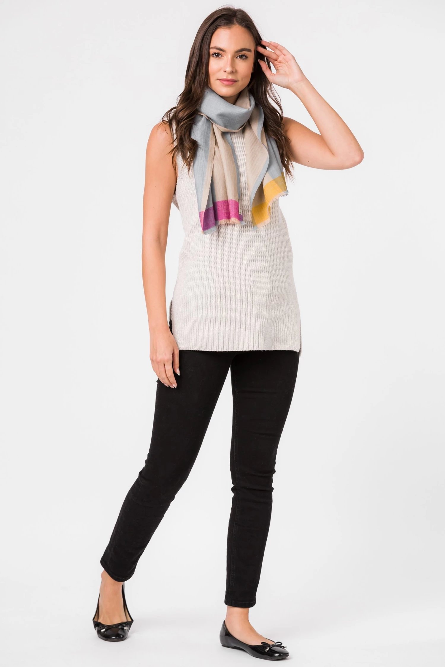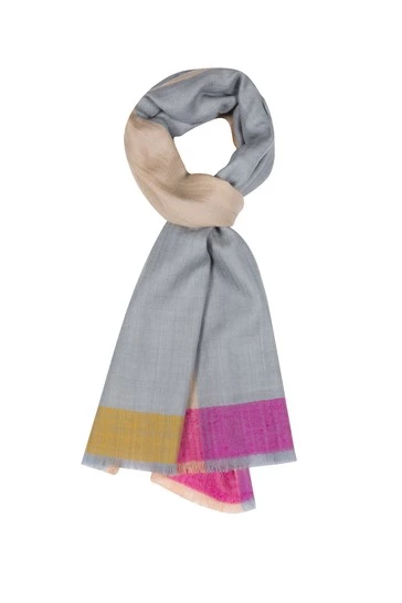 The ‘Hue’ neckerchief from Pure Luxuries London is woven from 50% cashmere and 50% merino wool blend for a soft yet durable feel. The bold yellow and pink with a more muted off white and grey, elevates this design. This versatile accessory can be worn around the neck as a neckerchief or as a smaller traditional scarf, adding subtle sophistication to your outfit. Pair with our other matching cashmere accessories. Presented in a 100% cotton Pure Luxuries branded pouch, ideal for gifting.