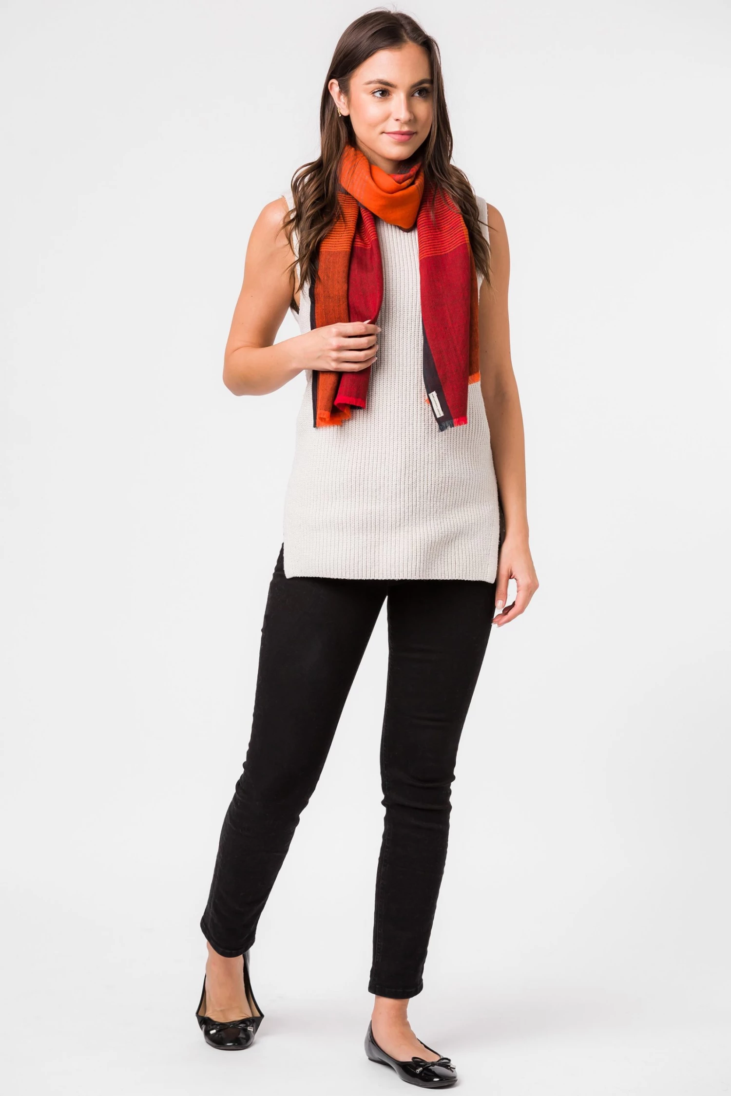 The ‘Libration’ scarf from Pure Luxuries London is woven from 50% cashmere and 50% merino wool blend for a soft yet durable feel. Features warm oranges, reds and blues with a striped colour-block design and herringbone detail. Perfect all year round for whenever the cold weather hits. An intricate knitted design gives this scarf a unique look. Pair with our other matching cashmere accessories. Presented in a 100% cotton Pure Luxuries branded pouch, ideal for gifting.