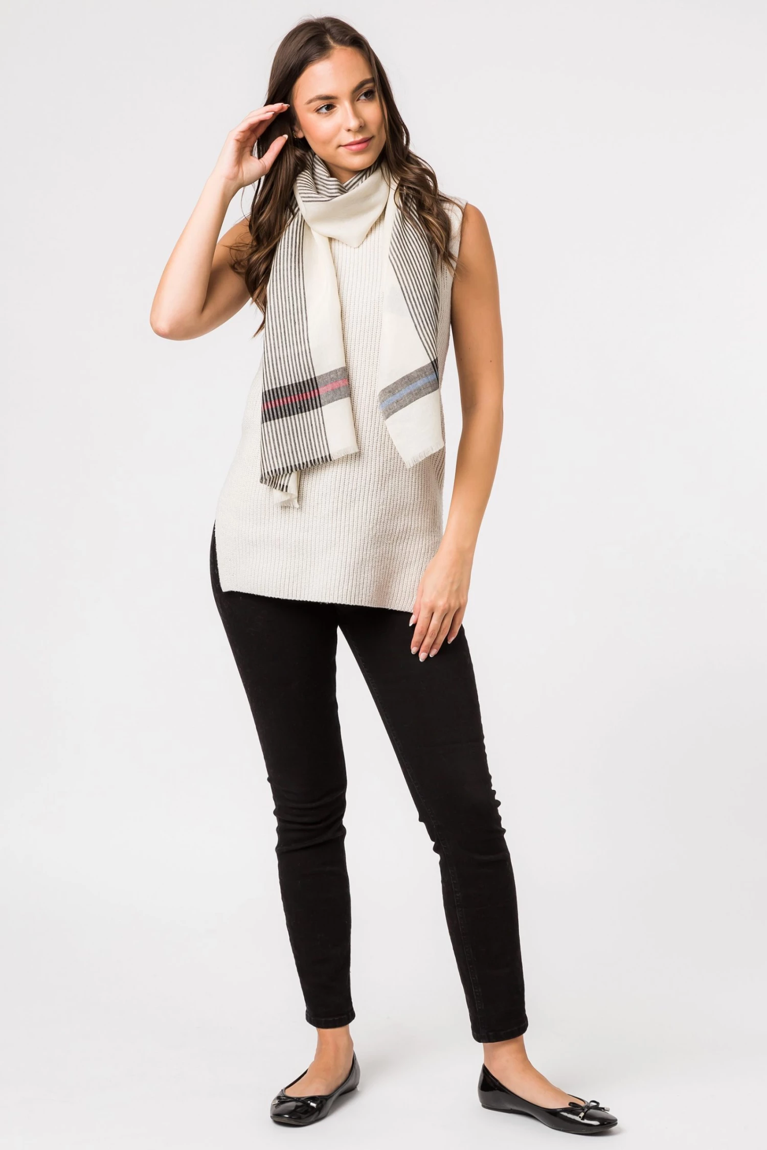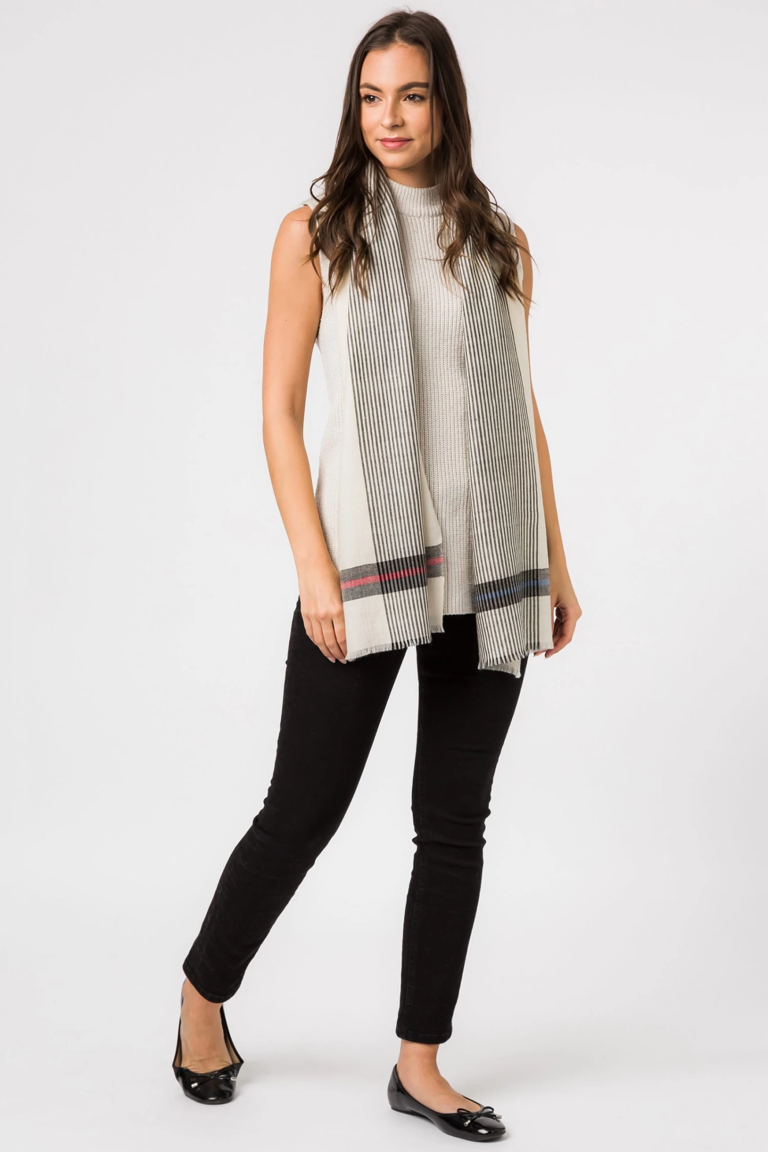 The ‘Pixel’ pashmina from Pure Luxuries London is woven from 50% cashmere and 50% merino wool blend for a soft yet durable feel. A classic black and white striped design elevated by stripes of blue and red. Create eye-catching looks in an instant with this beautiful and classic accessory. Can be worn multiple ways around the neck, depending on your style and preference. Pair with our matching cashmere accessories. Presented in a 100% cotton Pure Luxuries branded pouch, ideal for gifting.